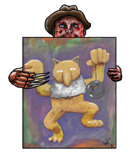 Digital art piece of Freddy holding a real painting of Hypno, painted by St George Stuff