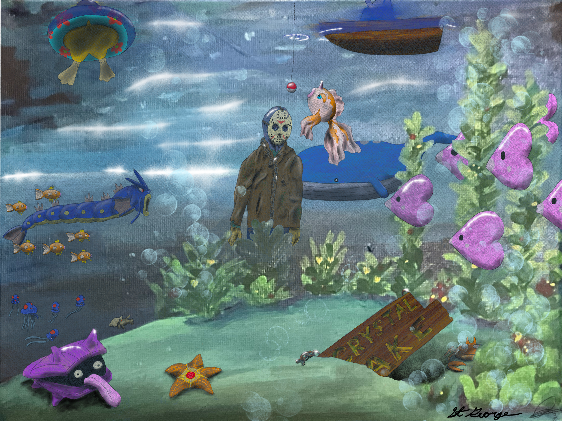 Jason Voorhees at the bottom of Crystal Lake, with Pokemon swimming around him. The water background is an acrylic painting that I then added Jason and the Pokemon into as digital art with Procreate.